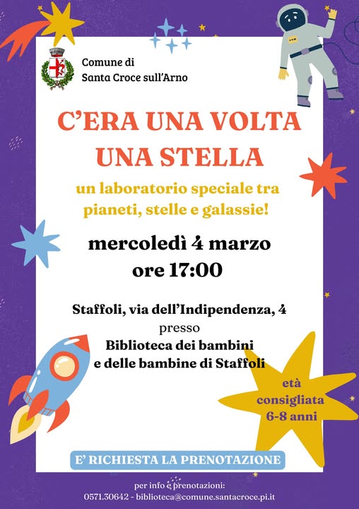 C'era una volta una stella a Staffoli: un laboratorio spaziale mercoledì 4 marzo alle ore 17.00 alla Biblioteca dei bambini e delle bambine di Staffoli.