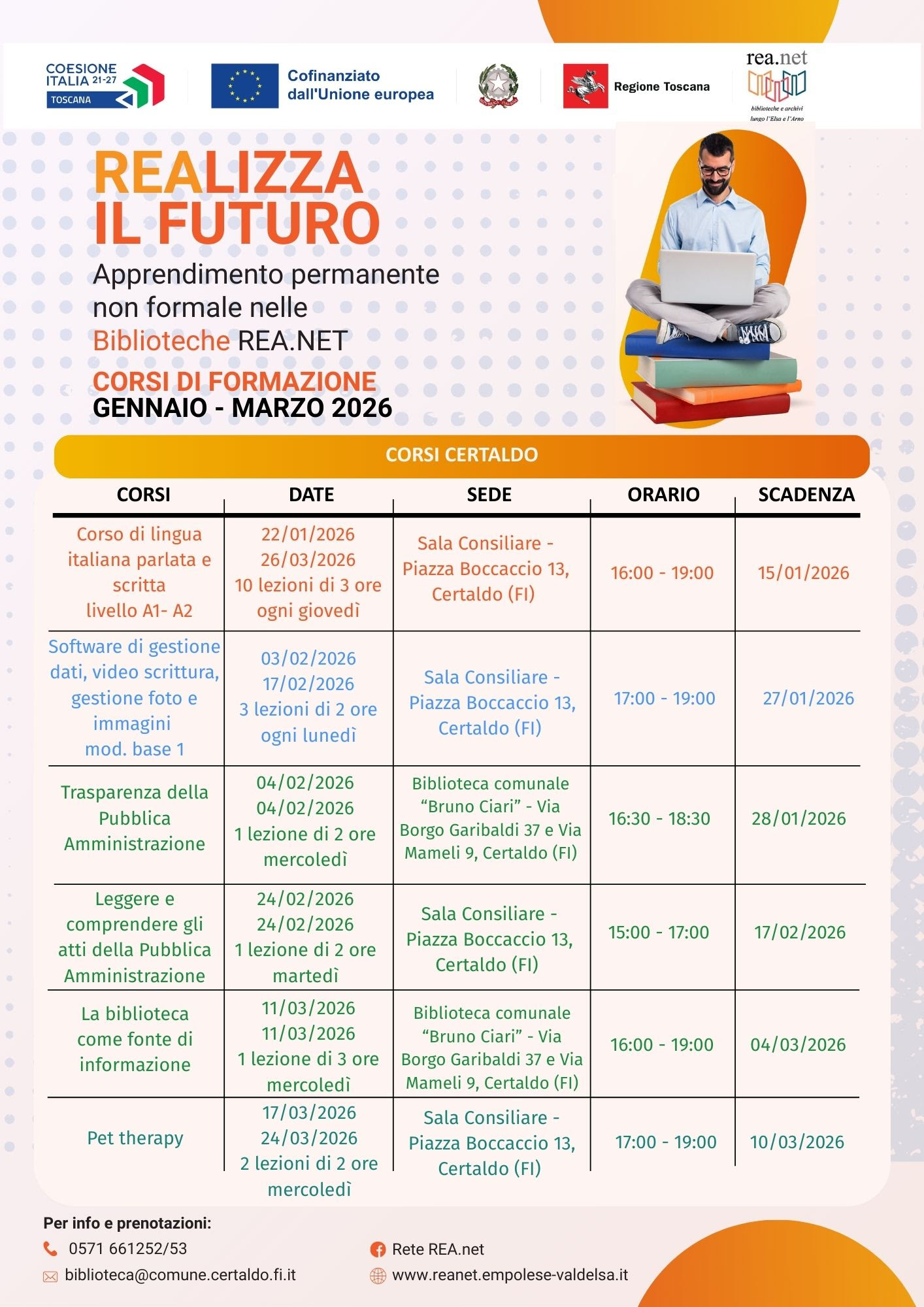 Riprendono i corsi gratuiti REA.NET in tutte le biblioteche di zona. Ecco i nuovi corsi da gennaio a marzo che si terranno nella nostra biblioteca o nella sala consiliare del comune, ma non dimenticate che ce ne sono moltissimi altri che vi aspettano in tutte le biblioteche del circondario.
