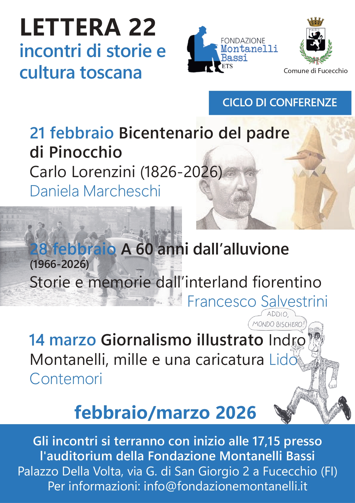 A partire dal 21 febbraio tornano le conferenze organizzate dalla Fondazione Montanelli Bassi con il patrocinio del Comune di Fucecchio. Quest’anno, sotto una nuova veste. Il titolo del ciclo è infatti “Lettera 22, Incontri di storie e cultura toscana”. Questo per ampliare il ‘ventaglio’ d’interesse dei temi trattati che potranno riguardare non solo determinati fatti o correnti succedutesi nei secoli nella nostra regione, ma anche personaggi, curiosità ed altre ricorrenze, con un particolare sguardo verso il mondo del giornalismo.