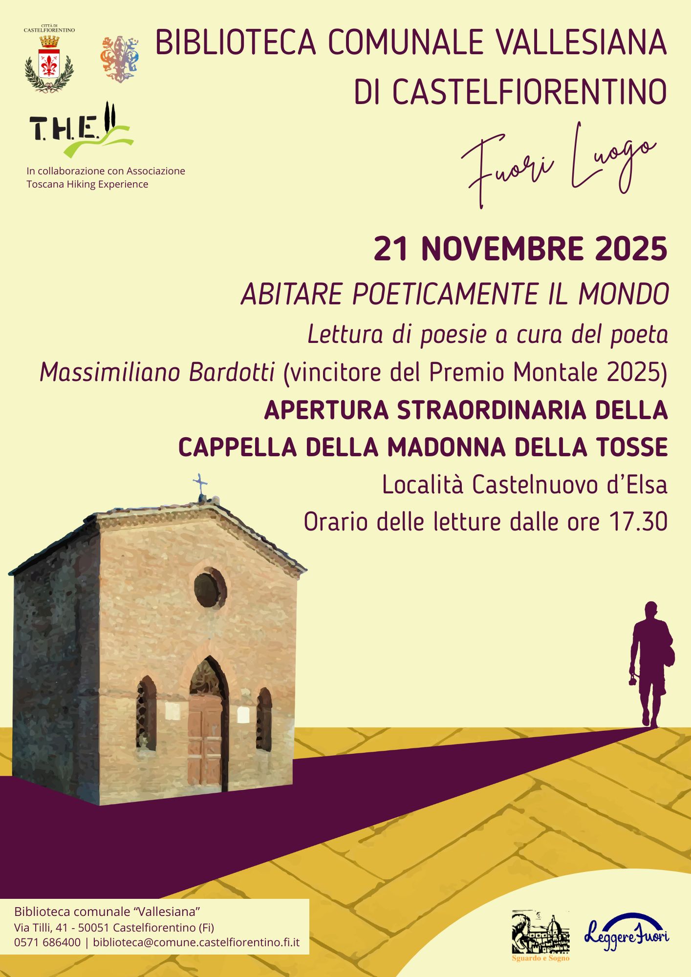 Promossa dalla Biblioteca Comunale “Vallesiana” nell’ambito di “Fuori luogo”, rassegna di narrazioni itineranti che quest’anno interessano il territorio aperto, l’iniziativa consentirà ai partecipanti di scoprire uno dei piccoli “gioielli” del patrimonio storico artistico recuperati di recente, oltre ad apprezzare i versi di uno dei poeti di Castelfiorentino che si sono particolarmente distinti per la sua sensibilità, religiosa e spirituale.