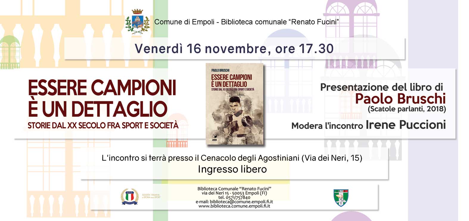 L’incontro prevede la presentazione del libro di Paolo Bruschi dal titolo “Essere campioni è un dettaglio” edito da Scatole parlanti.