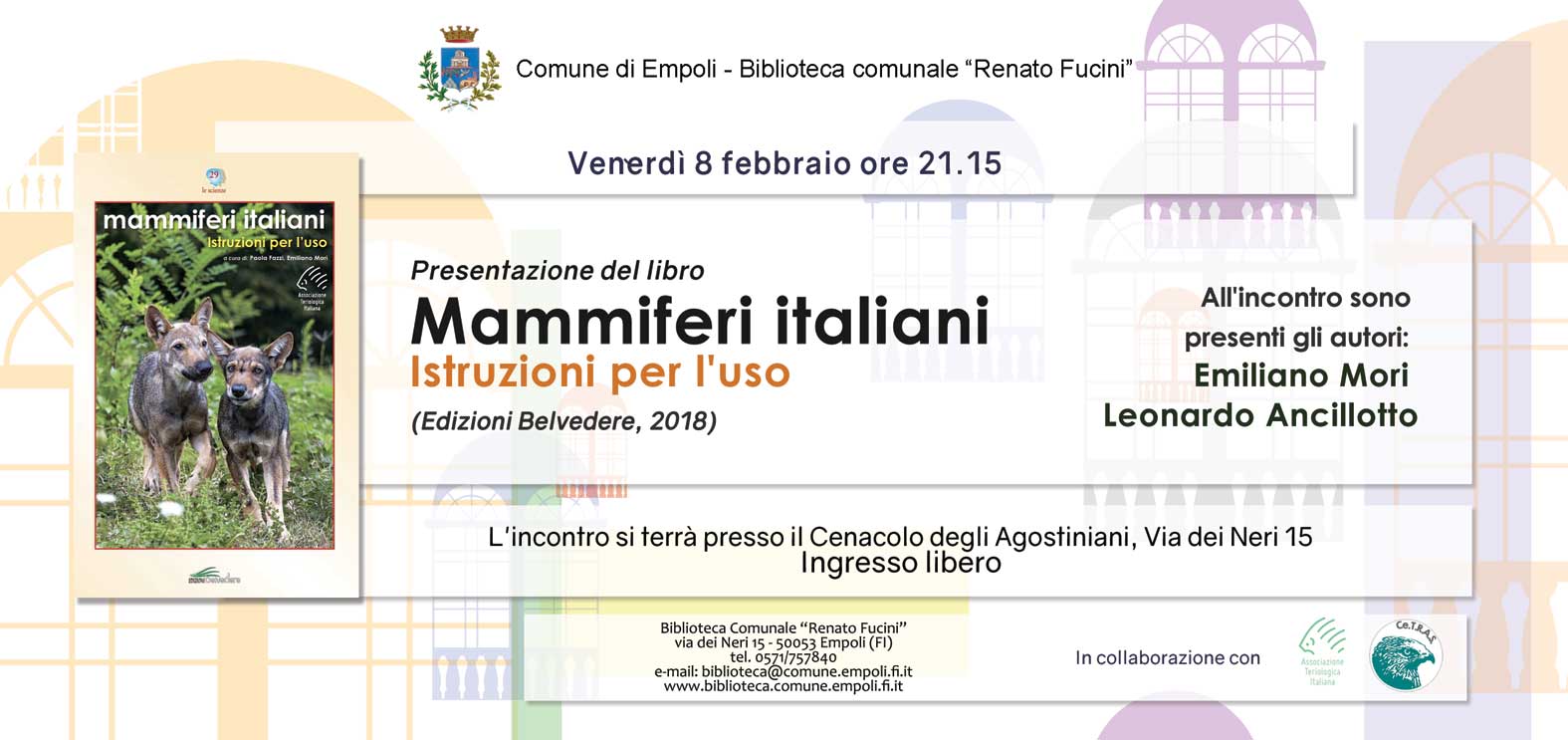Venerdì 8 febbraio alle 21.15 la Biblioteca “Renato Fucini di Empoli in collaborazione con il CeTRAS di Empoli (Centro toscano di recupero dell’Avifauna selvatica) organizza la presentazione del libro “Mammiferi italiani: istruzioni per l’uso” (Edizione Belvedere, 2018).